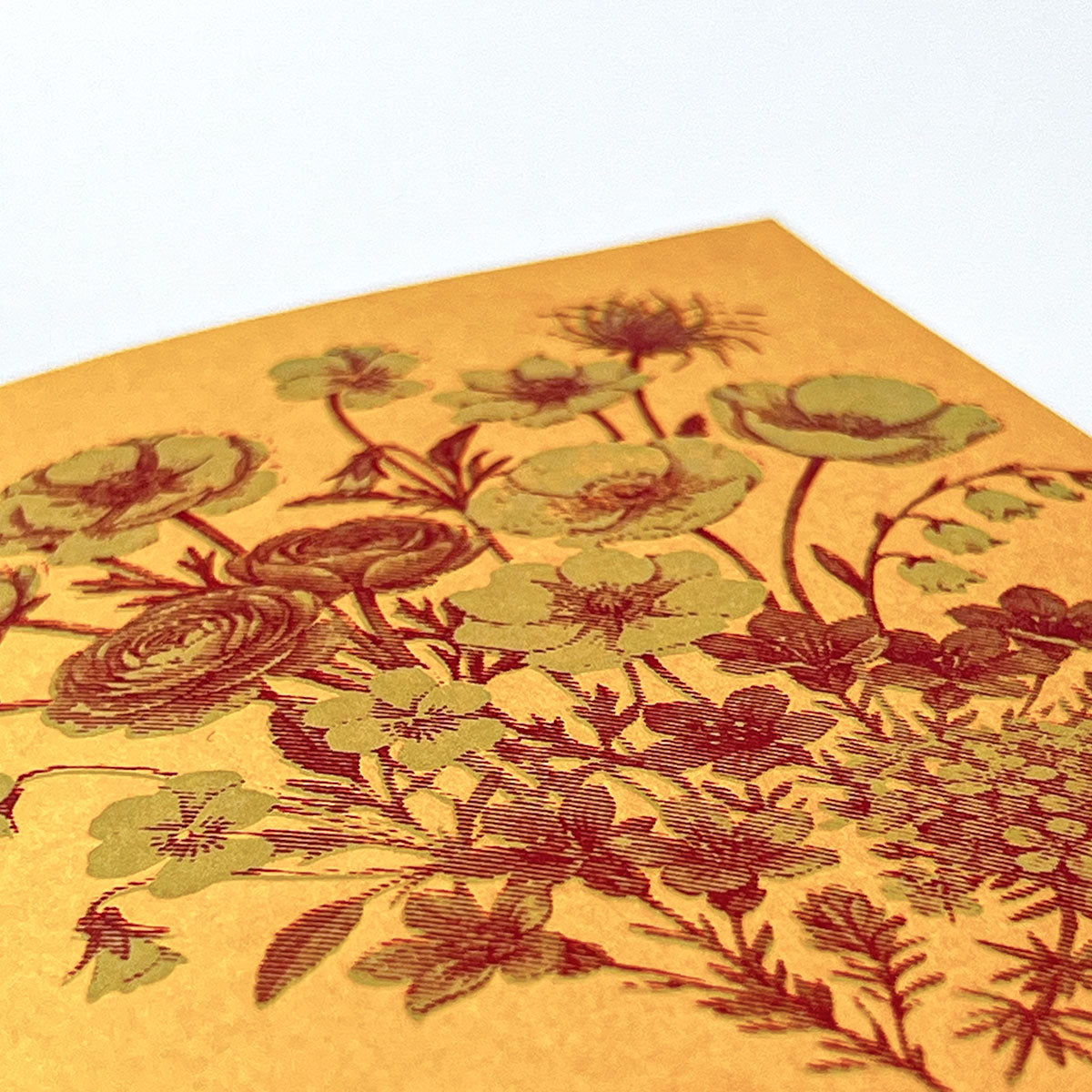 Mot det varme gule papiret ligger motivet trykt i to farger, lag for lag, med små variasjoner som gjør hvert kort unikt.