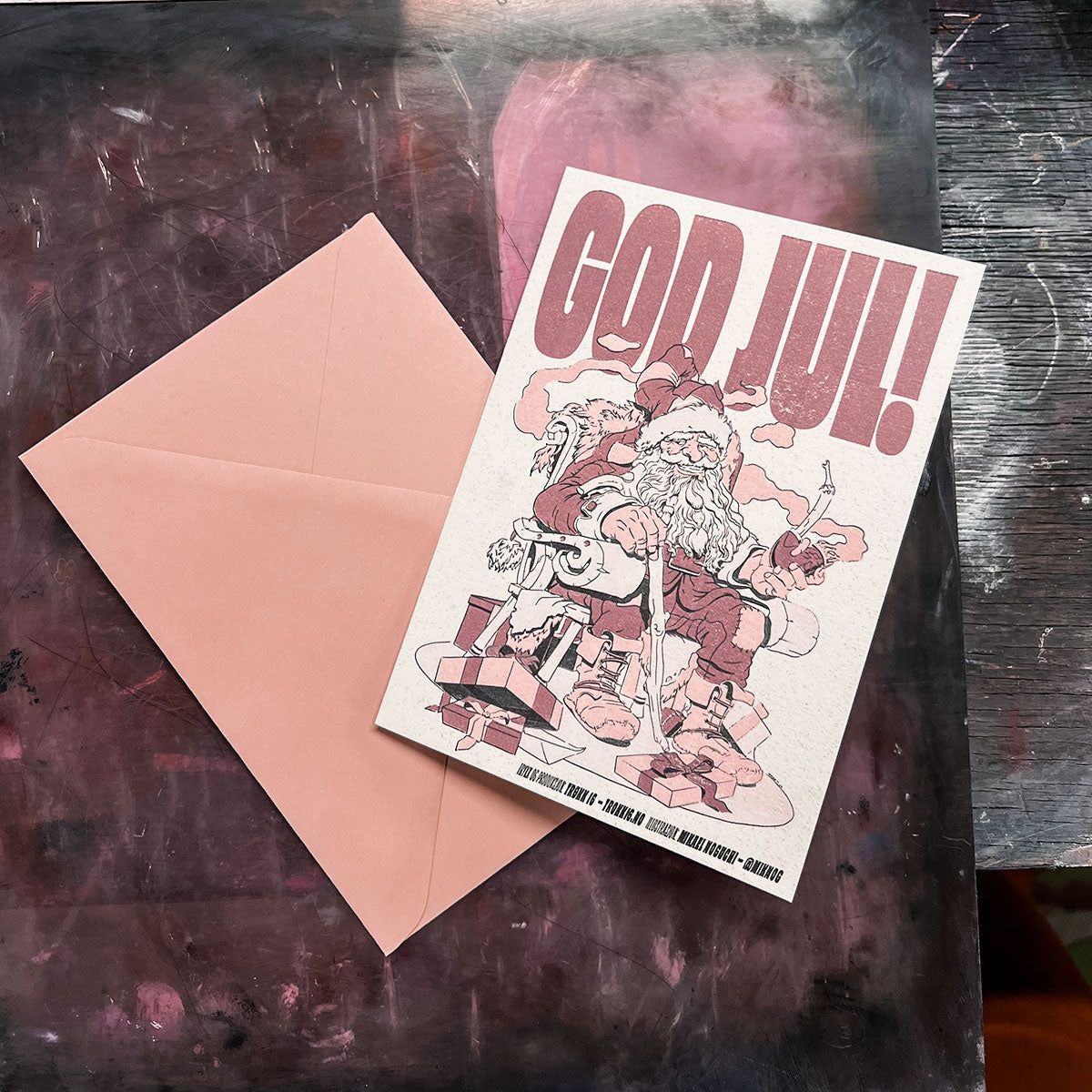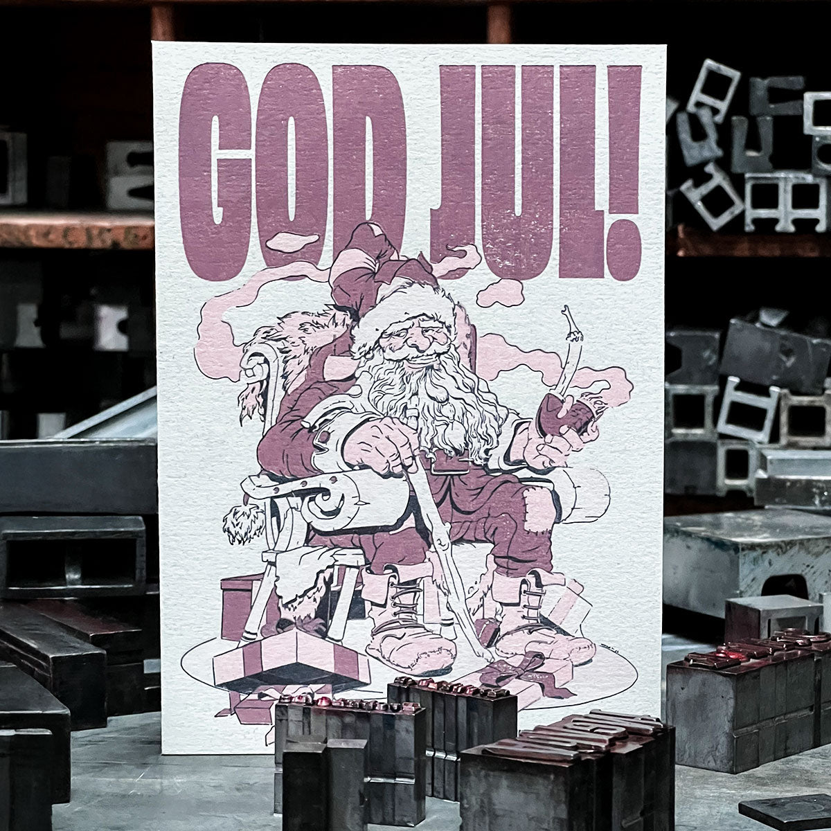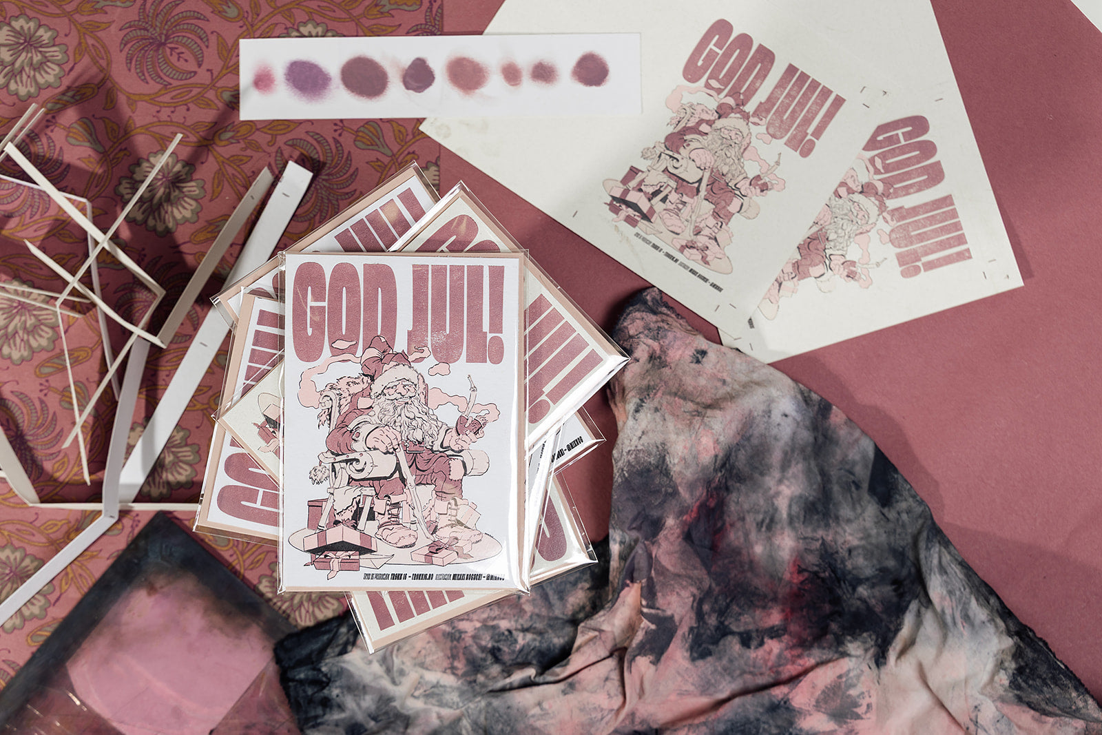 Resultatet er et varmt, lekent og litt annerledes julekort – trykt med omtanke, samarbeid og sverte på fingrene.